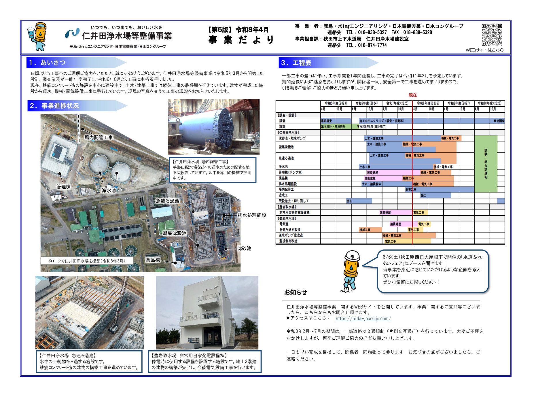 仁井田浄水場では、浄水場施設全てを、土木・建築工事→機械工事→電気工事の順で、工事を進め、令和9年度中旬からの試運転、令和9年度末の新浄水場への切り替えを目指します。