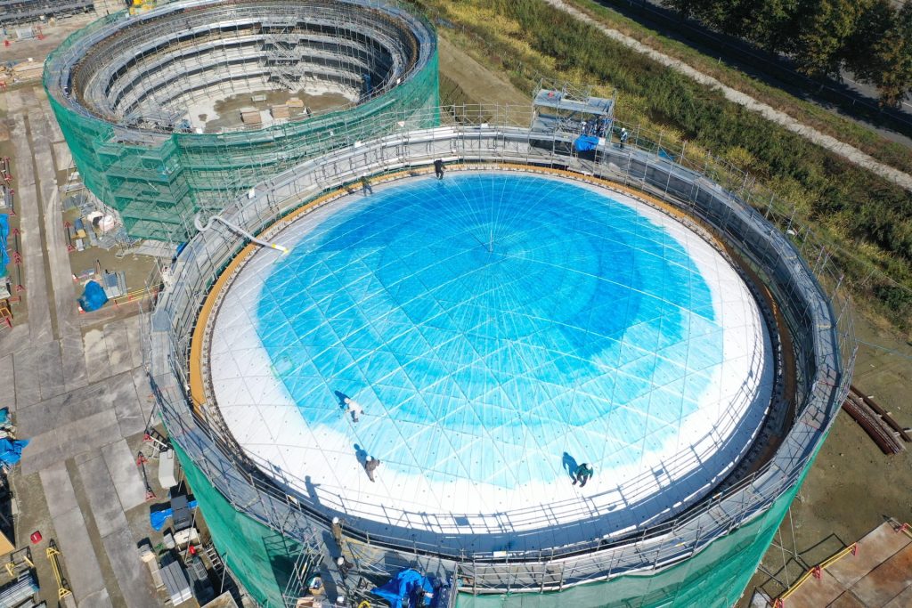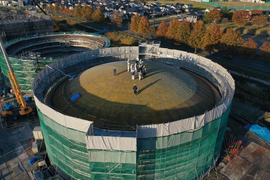 タンクは直径約30m・高さ約12mで、2池の施工を行っています。